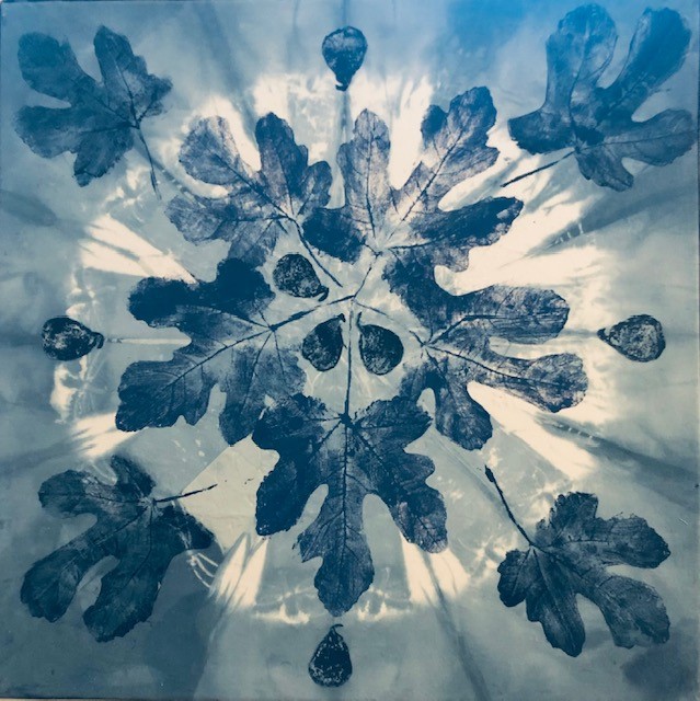 In Phoenix there used to be fig trees everywhere, and the past year she has been obsessed with them and the beautiful leaves they have. Melinda knew she could tell their story. Creating original one-of-a-kind hand-pulled monoprints, from real leaves Melinda collected from various trees and printing on tea bag paper and hand dyed Shibori fabric, "I feel they have come alive" she says.